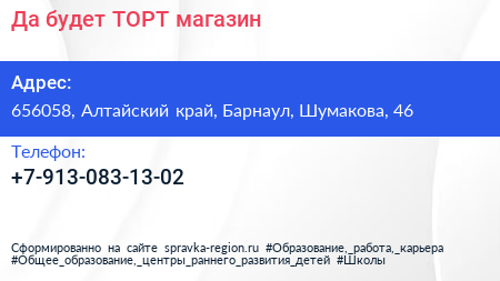 Да будет ТОРТ!, магазин по адресу 656058, Алтайский край, Барнаул, Шумакова, 46 в дальнейшем Организация, размещена в следующих категориях: