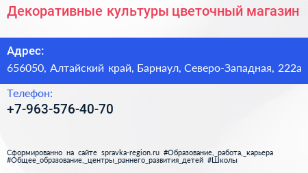 Декоративные культуры, цветочный магазин по адресу 656050, Алтайский край, Барнаул, Северо-Западная, 222а в дальнейшем Организация, размещена в следующих категориях: