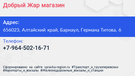 Добрый Жар, магазин по адресу 656023, Алтайский край, Барнаул, Германа Титова, 6 в дальнейшем Организация, размещена в следующих категориях: