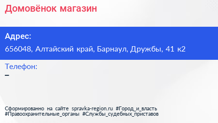 Домовёнок, магазин по адресу 656048, Алтайский край, Барнаул, Дружбы, 41 к2 в дальнейшем Организация, размещена в следующих категориях: