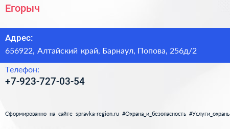 Егорыч по адресу 656922, Алтайский край, Барнаул, Попова, 256д/2 в дальнейшем Организация, размещена в следующих категориях: