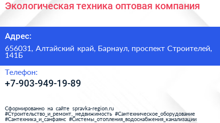 Экологическая техника, оптовая компания по адресу 656031, Алтайский край, Барнаул, проспект Строителей, 141Б в дальнейшем Организация, размещена в следующих категориях: