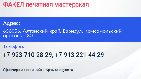 ФАКЕЛ, печатная мастерская по адресу 656056, Алтайский край, Барнаул, Комсомольский проспект, 80 в дальнейшем Организация, размещена в следующих категориях: