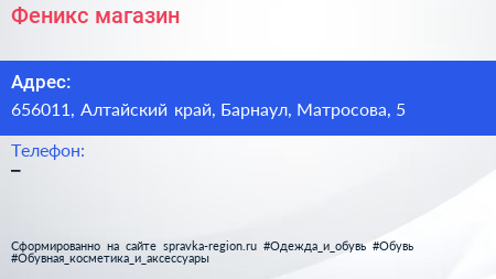 Феникс, магазин по адресу 656011, Алтайский край, Барнаул, Матросова, 5 в дальнейшем Организация, размещена в следующих категориях: