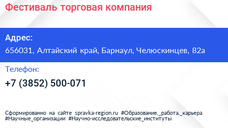 Фестиваль, торговая компания по адресу 656031, Алтайский край, Барнаул, Челюскинцев, 82а в дальнейшем Организация, размещена в следующих категориях: