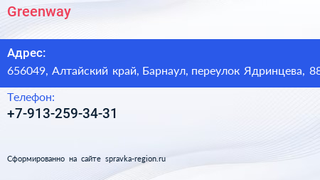 Greenway по адресу 656049, Алтайский край, Барнаул, переулок Ядринцева, 88 в дальнейшем Организация, размещена в следующих категориях: