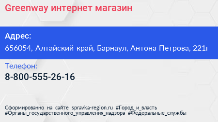 Greenway, интернет-магазин по адресу 656054, Алтайский край, Барнаул, Антона Петрова, 221г в дальнейшем Организация, размещена в следующих категориях: