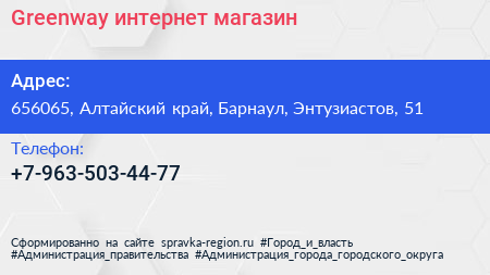 Greenway, интернет-магазин по адресу 656065, Алтайский край, Барнаул, Энтузиастов, 51 в дальнейшем Организация, размещена в следующих категориях: