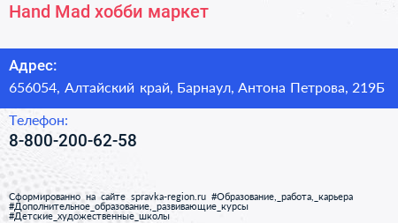 Hand Mad, хобби-маркет по адресу 656054, Алтайский край, Барнаул, Антона Петрова, 219Б в дальнейшем Организация, размещена в следующих категориях: