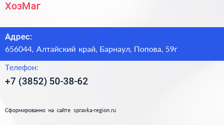 ХозМаг по адресу 656044, Алтайский край, Барнаул, Попова, 59г в дальнейшем Организация, размещена в следующих категориях:
