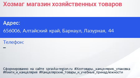Хозмаг, магазин хозяйственных товаров по адресу 656006, Алтайский край, Барнаул, Лазурная, 44 в дальнейшем Организация, размещена в следующих категориях: