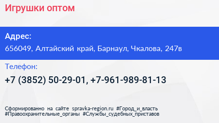 Игрушки оптом по адресу 656049, Алтайский край, Барнаул, Чкалова, 247в в дальнейшем Организация, размещена в следующих категориях: