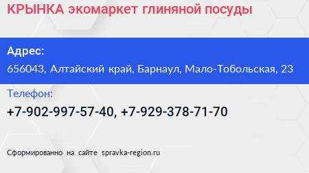 КРЫНКА, экомаркет глиняной посуды по адресу 656043, Алтайский край, Барнаул, Мало-Тобольская, 23 в дальнейшем Организация, размещена в следующих категориях:
