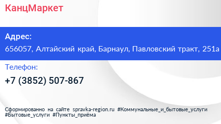 КанцМаркет по адресу 656057, Алтайский край, Барнаул, Павловский тракт, 251а в дальнейшем Организация, размещена в следующих категориях: