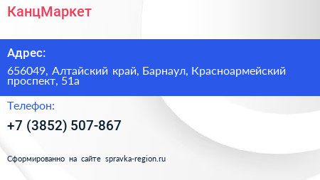 КанцМаркет по адресу 656049, Алтайский край, Барнаул, Красноармейский проспект, 51а в дальнейшем Организация, размещена в следующих категориях: