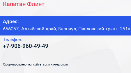 Капитан Флинт по адресу 656057, Алтайский край, Барнаул, Павловский тракт, 251в в дальнейшем Организация, размещена в следующих категориях: