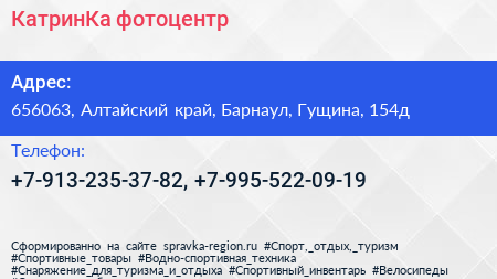 КатринКа, фотоцентр по адресу 656063, Алтайский край, Барнаул, Гущина, 154д в дальнейшем Организация, размещена в следующих категориях:
