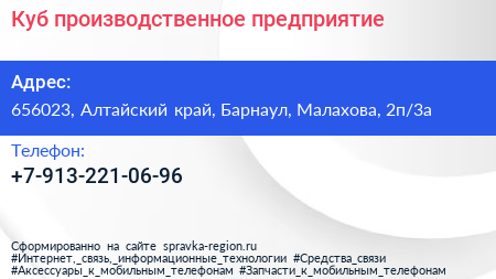 Куб, производственное предприятие по адресу 656023, Алтайский край, Барнаул, Малахова, 2п/3а в дальнейшем Организация, размещена в следующих категориях: