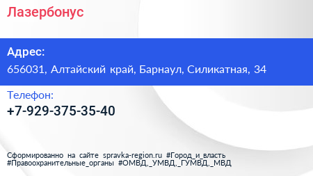 Лазербонус по адресу 656031, Алтайский край, Барнаул, Силикатная, 34 в дальнейшем Организация, размещена в следующих категориях: