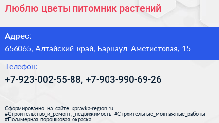 Люблю цветы, питомник растений по адресу 656065, Алтайский край, Барнаул, Аметистовая, 15 в дальнейшем Организация, размещена в следующих категориях: