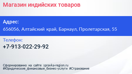 Магазин индийских товаров по адресу 656056, Алтайский край, Барнаул, Пролетарская, 55 в дальнейшем Организация, размещена в следующих категориях: