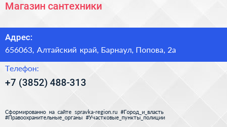 Магазин сантехники по адресу 656063, Алтайский край, Барнаул, Попова, 2а в дальнейшем Организация, размещена в следующих категориях: