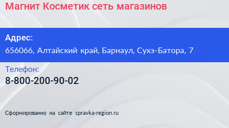 Магнит Косметик, сеть магазинов по адресу 656066, Алтайский край, Барнаул, Сухэ-Батора, 7 в дальнейшем Организация, размещена в следующих категориях: