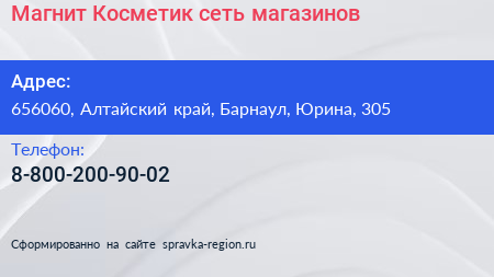Магнит Косметик, сеть магазинов по адресу 656060, Алтайский край, Барнаул, Юрина, 305 в дальнейшем Организация, размещена в следующих категориях: