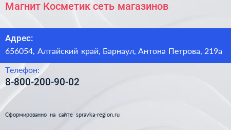 Магнит Косметик, сеть магазинов по адресу 656054, Алтайский край, Барнаул, Антона Петрова, 219а в дальнейшем Организация, размещена в следующих категориях: