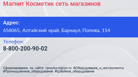 Магнит Косметик, сеть магазинов по адресу 656065, Алтайский край, Барнаул, Попова, 114 в дальнейшем Организация, размещена в следующих категориях: