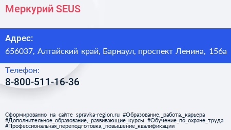 Меркурий SEUS по адресу 656037, Алтайский край, Барнаул, проспект Ленина, 156а в дальнейшем Организация, размещена в следующих категориях: