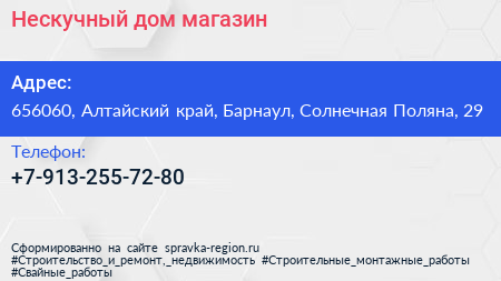 Нескучный дом, магазин по адресу 656060, Алтайский край, Барнаул, Солнечная Поляна, 29 в дальнейшем Организация, размещена в следующих категориях: