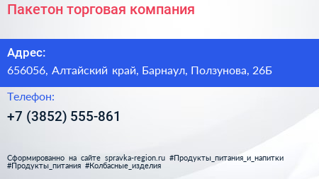 Пакетон, торговая компания по адресу 656056, Алтайский край, Барнаул, Ползунова, 26Б в дальнейшем Организация, размещена в следующих категориях: