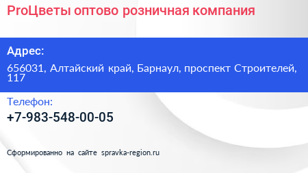 ProЦветы, оптово-розничная компания по адресу 656031, Алтайский край, Барнаул, проспект Строителей, 117 в дальнейшем Организация, размещена в следующих категориях: