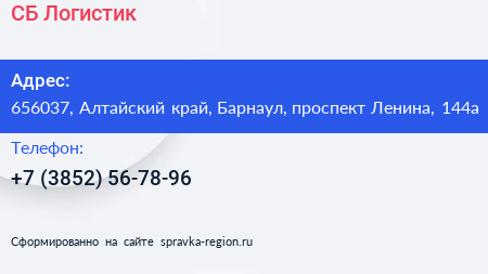 СБ Логистик по адресу 656037, Алтайский край, Барнаул, проспект Ленина, 144а в дальнейшем Организация, размещена в следующих категориях: