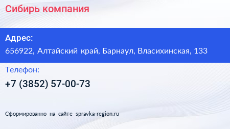Сибирь, компания по адресу 656922, Алтайский край, Барнаул, Власихинская, 133 в дальнейшем Организация, размещена в следующих категориях: