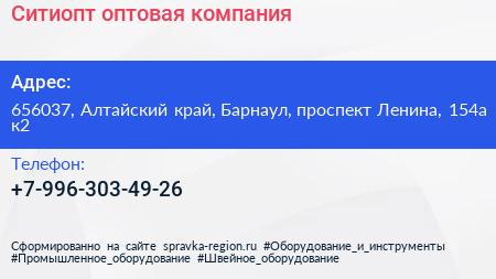 Ситиопт, оптовая компания по адресу 656037, Алтайский край, Барнаул, проспект Ленина, 154а к2 в дальнейшем Организация, размещена в следующих категориях: