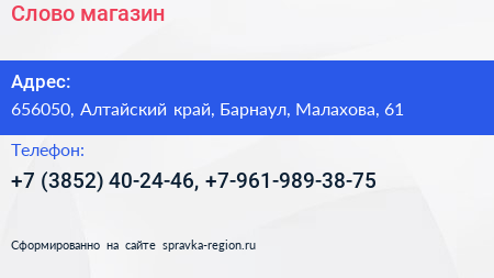 Слово, магазин по адресу 656050, Алтайский край, Барнаул, Малахова, 61 в дальнейшем Организация, размещена в следующих категориях: