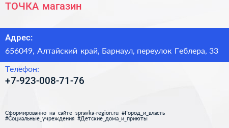 ТОЧКА, магазин по адресу 656049, Алтайский край, Барнаул, переулок Геблера, 33 в дальнейшем Организация, размещена в следующих категориях: