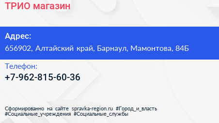 ТРИО, магазин по адресу 656902, Алтайский край, Барнаул, Мамонтова, 84Б в дальнейшем Организация, размещена в следующих категориях: