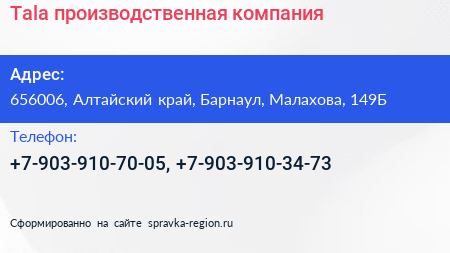 Tala, производственная компания по адресу 656006, Алтайский край, Барнаул, Малахова, 149Б в дальнейшем Организация, размещена в следующих категориях: