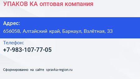 УПАКОВ-КА, оптовая компания по адресу 656058, Алтайский край, Барнаул, Взлётная, 33 в дальнейшем Организация, размещена в следующих категориях: