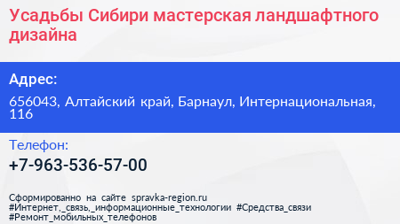 Усадьбы Сибири, мастерская ландшафтного дизайна по адресу 656043, Алтайский край, Барнаул, Интернациональная, 116 в дальнейшем Организация, размещена в следующих категориях: