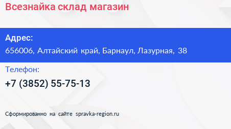 Всезнайка, склад-магазин по адресу 656006, Алтайский край, Барнаул, Лазурная, 38 в дальнейшем Организация, размещена в следующих категориях: