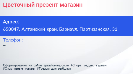 Цветочный презент, магазин по адресу 658047, Алтайский край, Барнаул, Партизанская, 31 в дальнейшем Организация, размещена в следующих категориях: