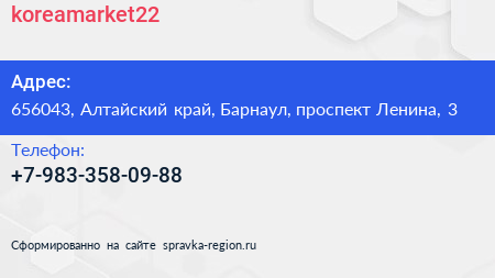 koreamarket22 по адресу 656043, Алтайский край, Барнаул, проспект Ленина, 3 в дальнейшем Организация, размещена в следующих категориях: