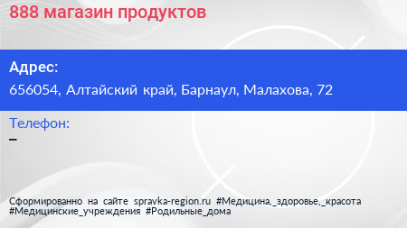 888, магазин продуктов по адресу 656054, Алтайский край, Барнаул, Малахова, 72 в дальнейшем Организация, размещена в следующих категориях: