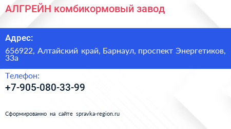 АЛГРЕЙН, комбикормовый завод по адресу 656922, Алтайский край, Барнаул, проспект Энергетиков, 33а в дальнейшем Организация, размещена в следующих категориях: