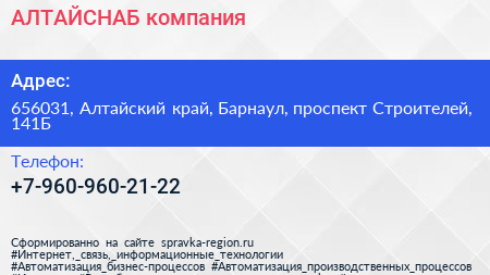 АЛТАЙСНАБ, компания по адресу 656031, Алтайский край, Барнаул, проспект Строителей, 141Б в дальнейшем Организация, размещена в следующих категориях: