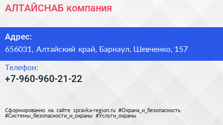 АЛТАЙСНАБ, компания по адресу 656031, Алтайский край, Барнаул, Шевченко, 157 в дальнейшем Организация, размещена в следующих категориях: